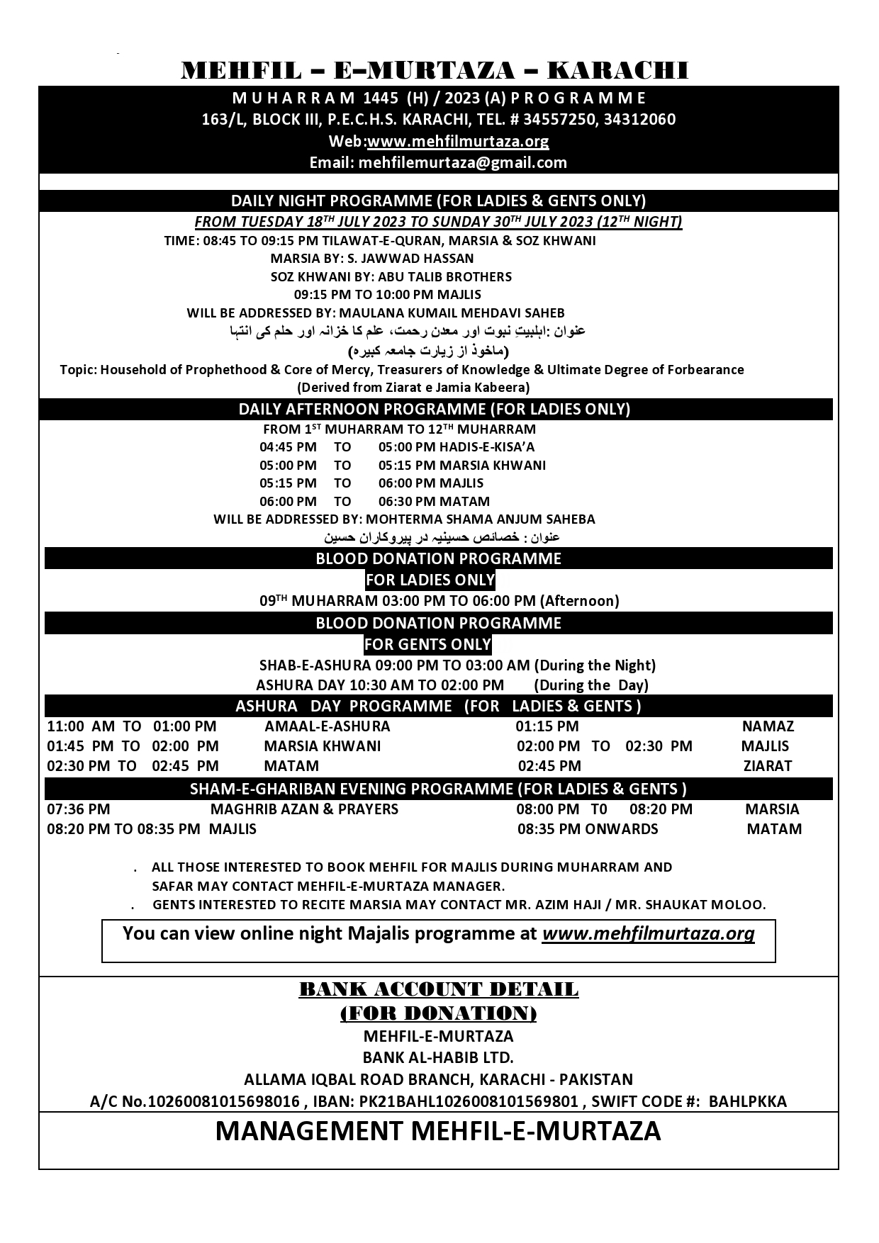 MUHARRAM 1445/2023 PROGRAMME โ MEHFIL E MURTAZA PECHS KARACHI